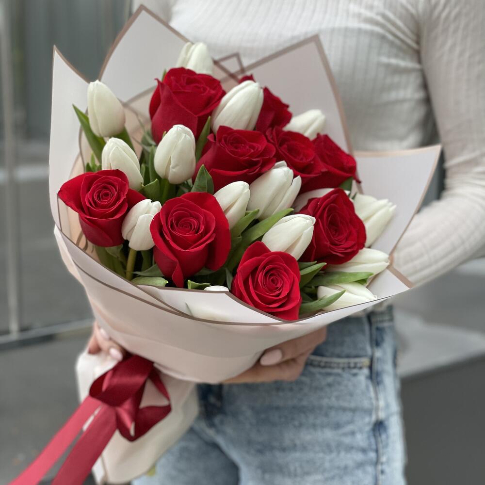 Букет Идиллия из красных роз и белых тюльпанов в Жердевке