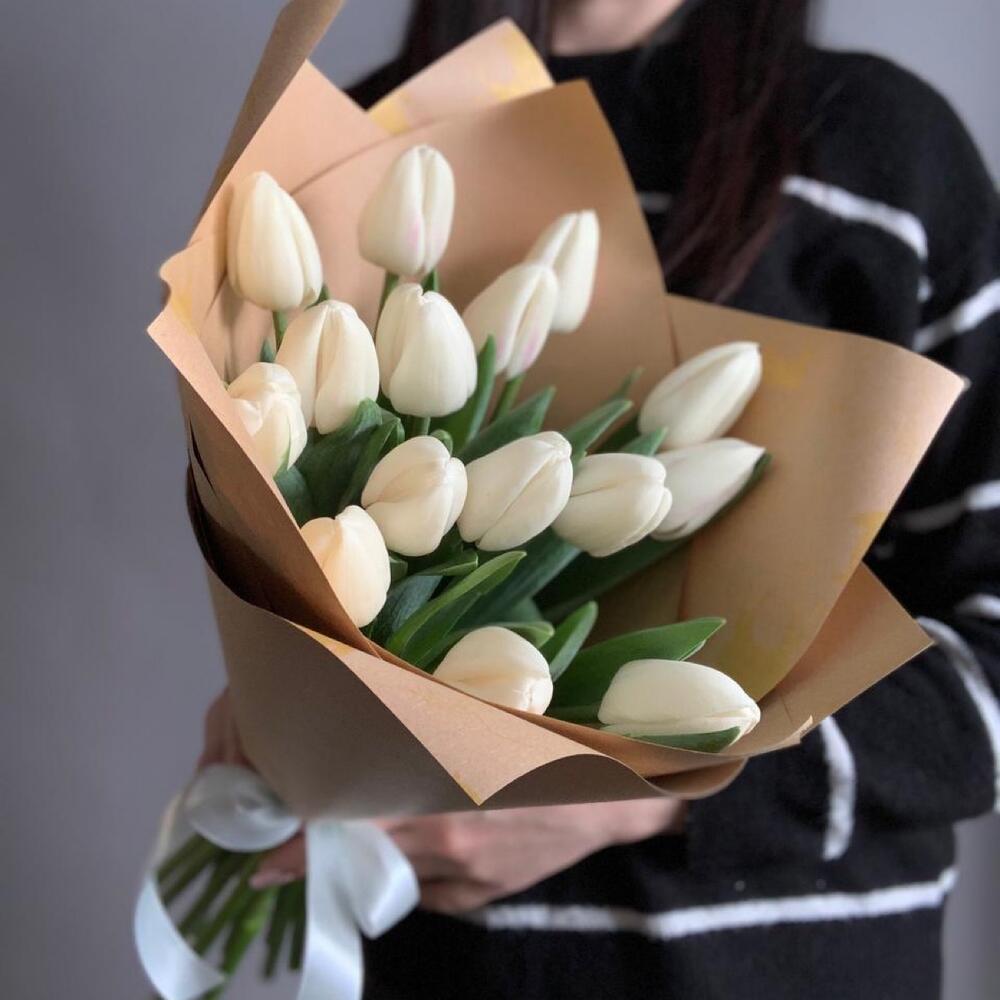 Охапка белоснежных Тюльпанов в Стильной дизайнерской упаковке .